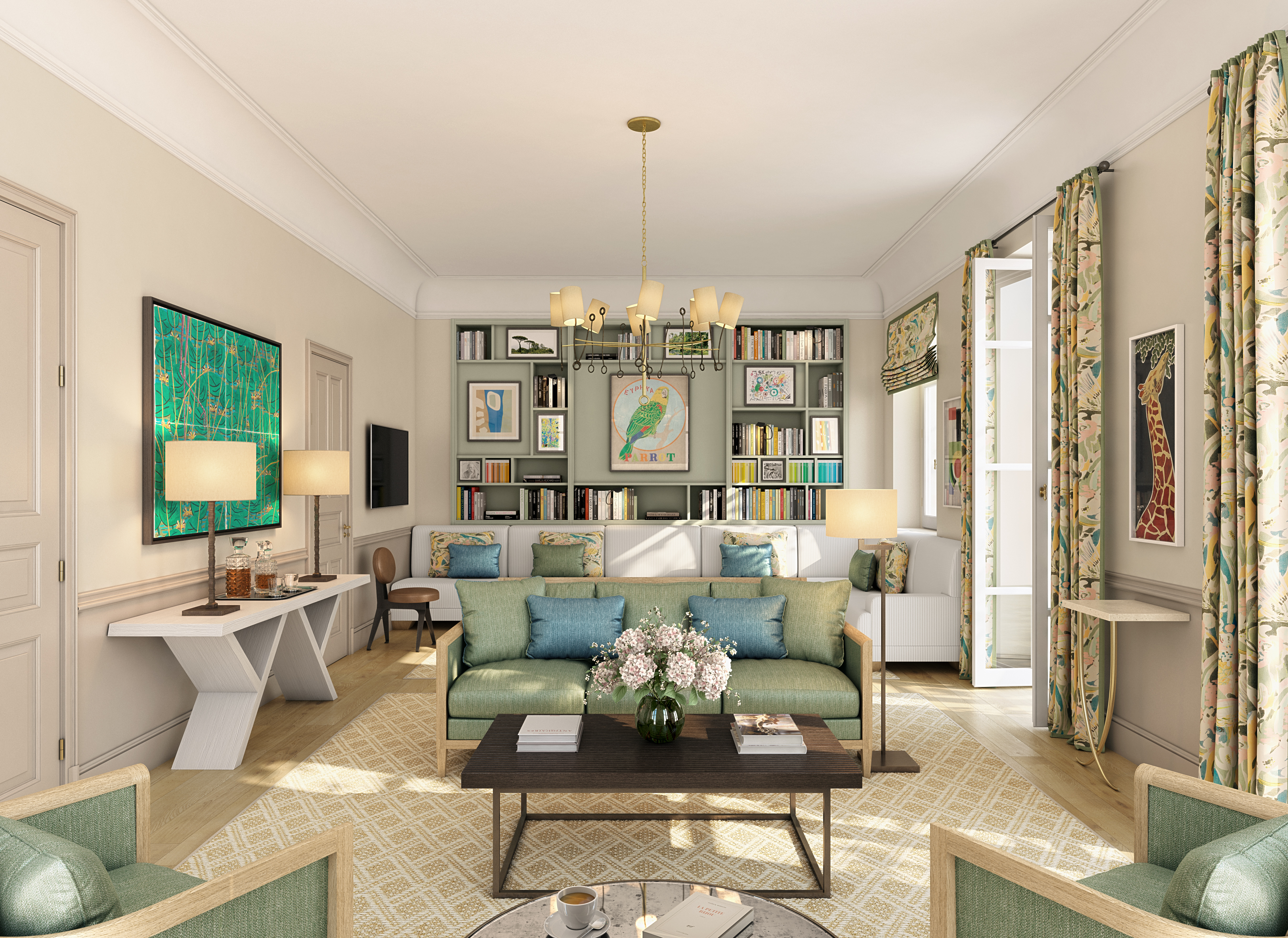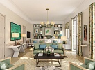 Интерьеры виллы были созданы Бергит Грэфин Дуглас, основательницей дизайн-бюро MM-Design во Франкфурте. Она искусно смешала старинную мебель и натуральные материалы – хлопок, лен, ротанг, и заново переписала стиль летнего дома в светлых тонах, выбрав опаловый и «шампань», напоминающие нежные краски Средиземноморья. В интерьере использована мебель, выполненная на заказ и неповторяющаяся в разных пространствах, например, журнальные столики или геридоны, созданные знаменитым архитектором интерьеров Кристианом Лиэгром, чей элегантный стиль буквально произвел фурор в 1980-1990 годах. Деревянные панели светло-серого цвета (элемент фирменного стиля госпожи Дуглас) сочетаются с натуральными тканями бледно-зеленого и нежно-розового тонов. Центральную лестницу украшает подвесной светильник Luna с деликатным рассеянным светом, созданный декоратором Аленом Эллузом.