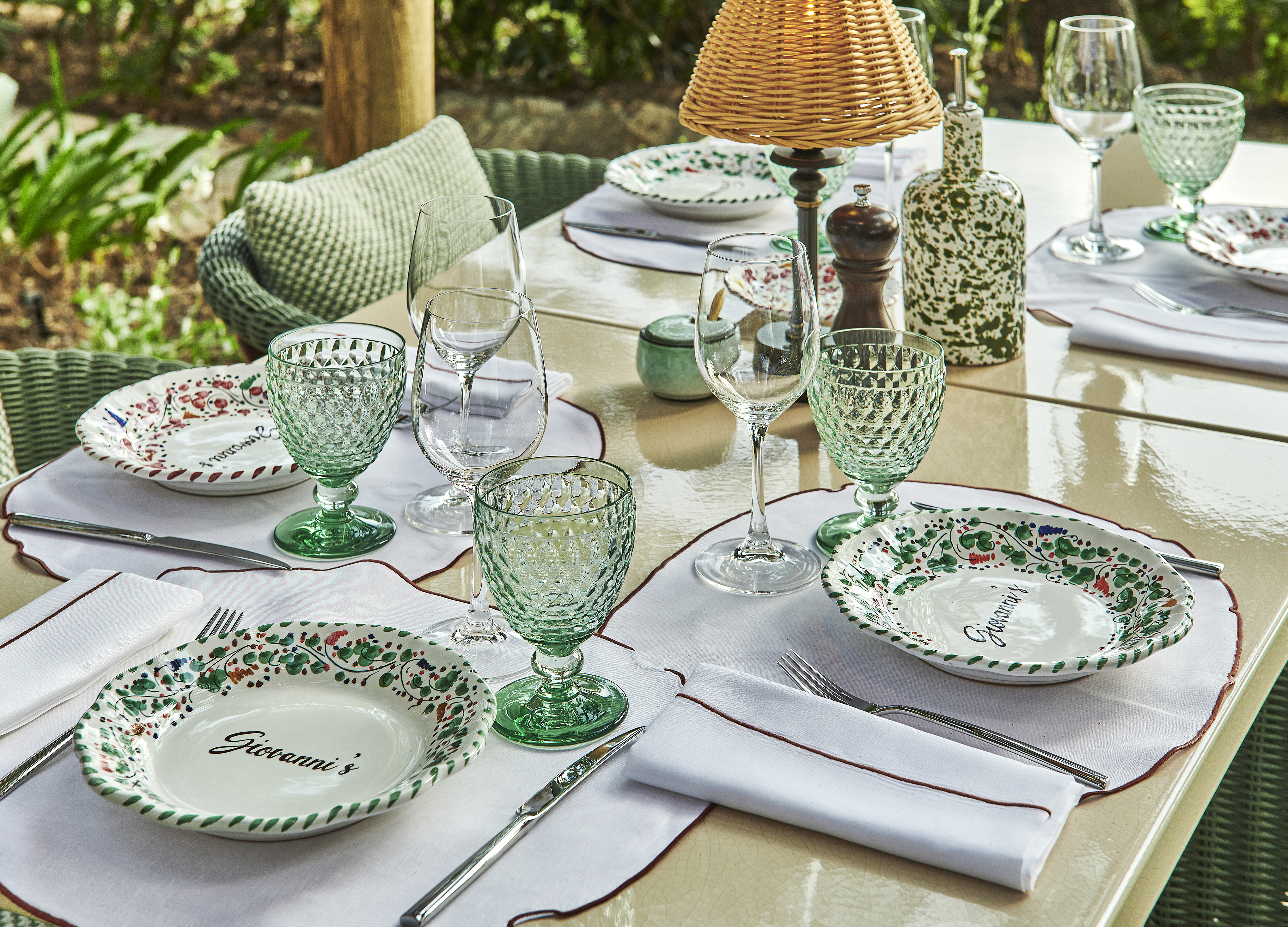 В Giovanni’s 60 посадочных мест, его оформлением занимались дизайнер интерьеров Патрисия Анастассиадис и архитектор Люк Светчин. Белые столы из лавового камня дополнены зелеными плетеными креслами Bonacina, эта цветовая палитра гармонично сочетается с окружающей природой. Расположены столы в увитой виноградной лозой беседке, вокруг центрального фонтана, отсылающего к итальянским площадям.