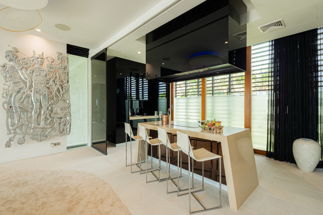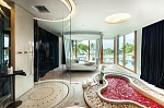Номер представляет собой пространство открытой планировки с уникальным футуристическим дизайном от Грэхема Лэмба: